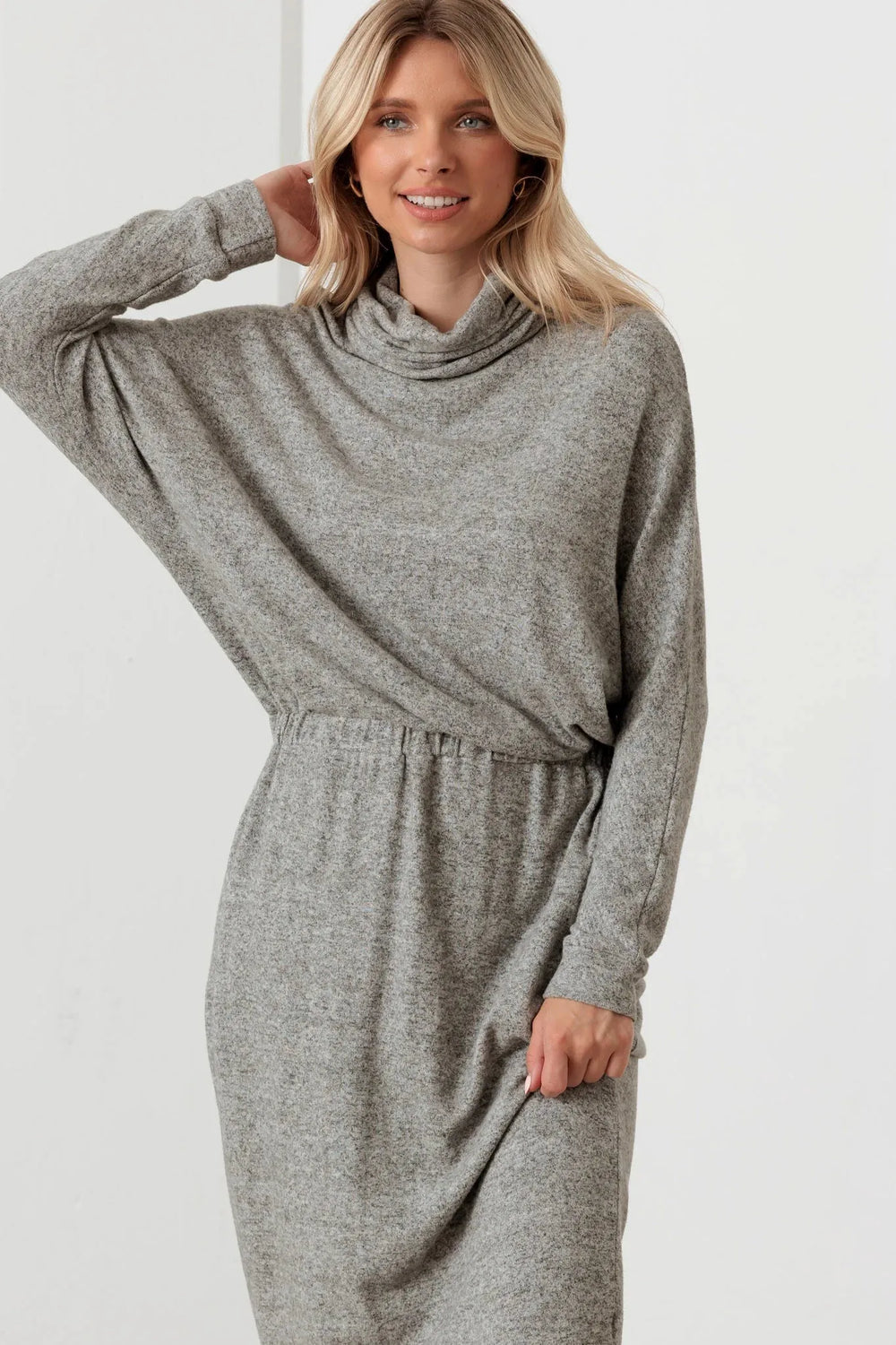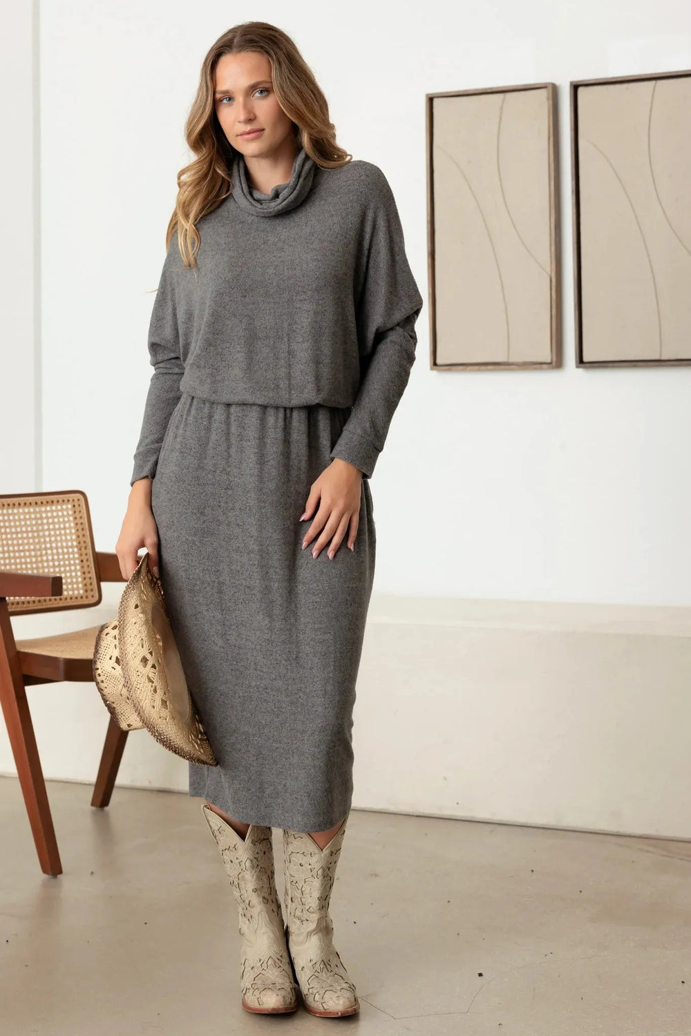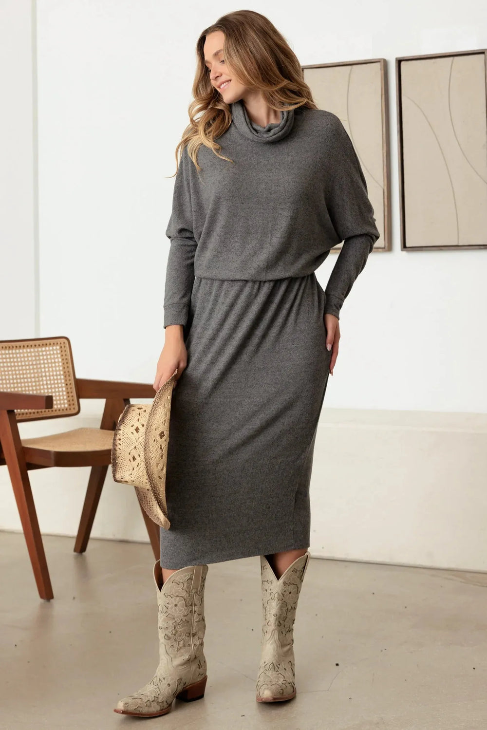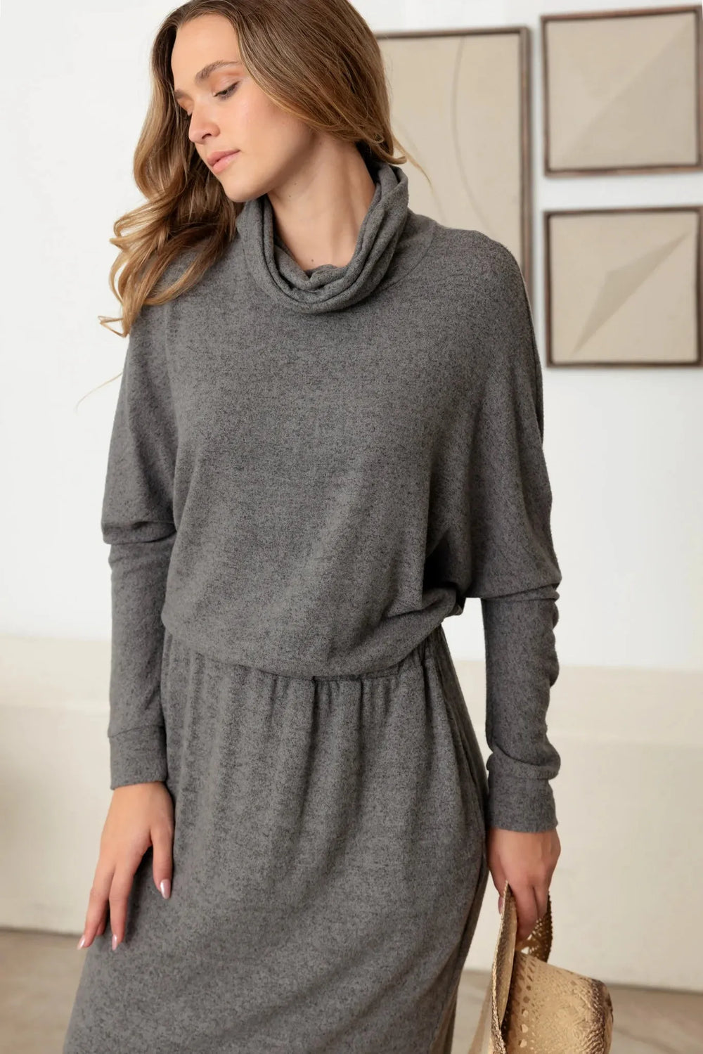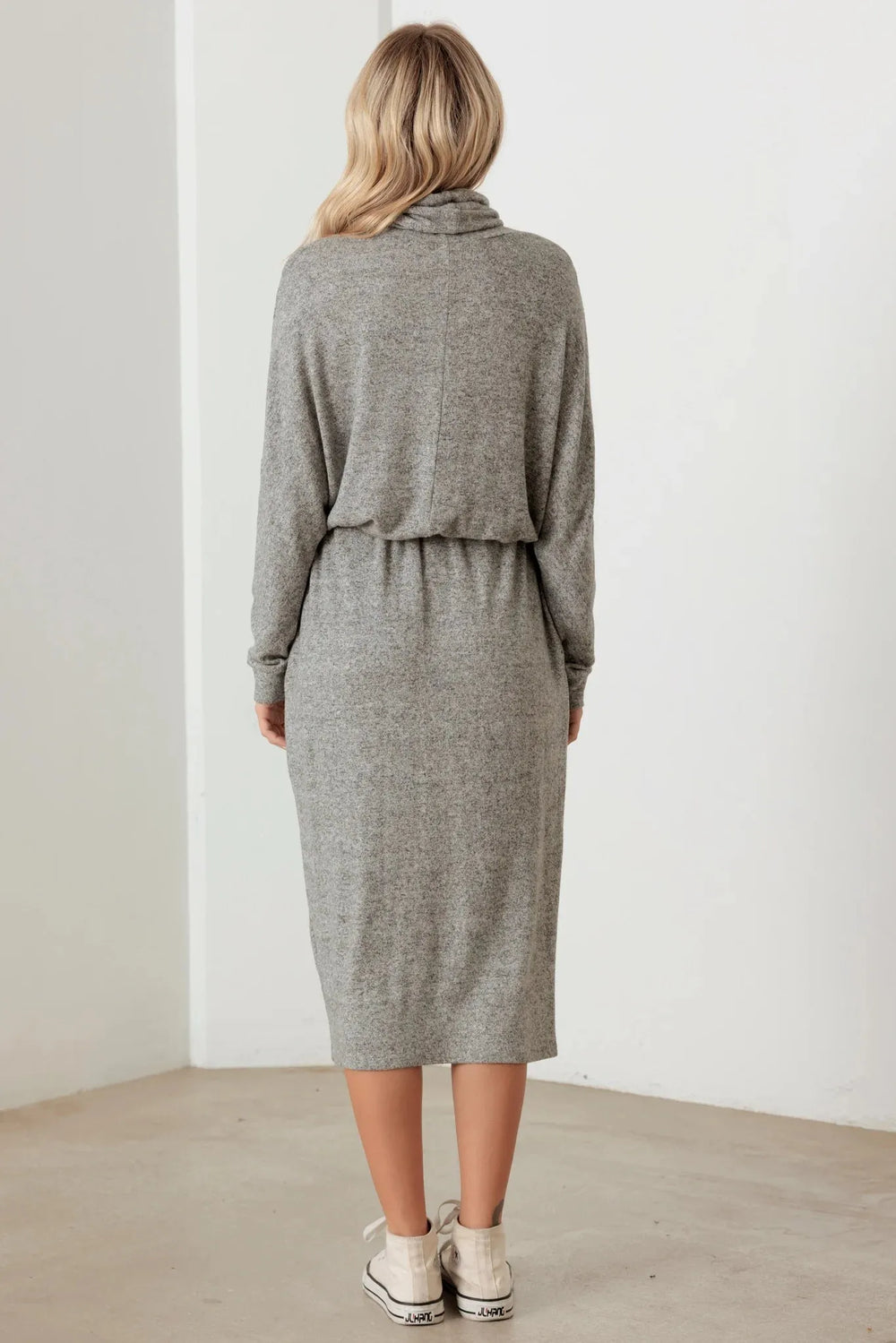 This Heather Grey Turtle Neck Elastic Waist Long Sleeve Midi Dress is the perfect blend of style and comfort. The soft fabric and long sleeves will keep you warm and cozy, while the turtle neck adds a touch of sophistication. Perfect for any occasion, this midi dress will elevate your wardrobe.