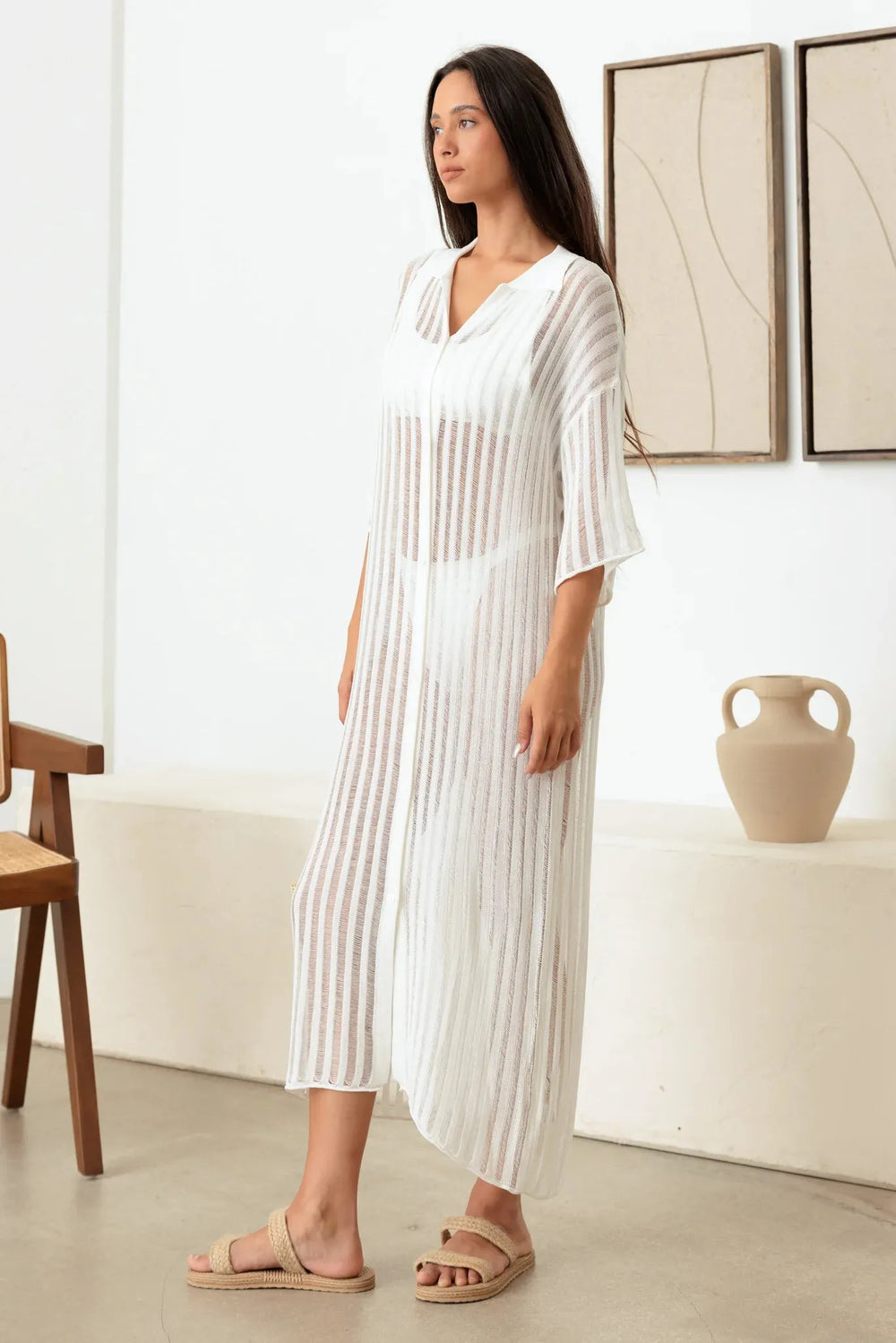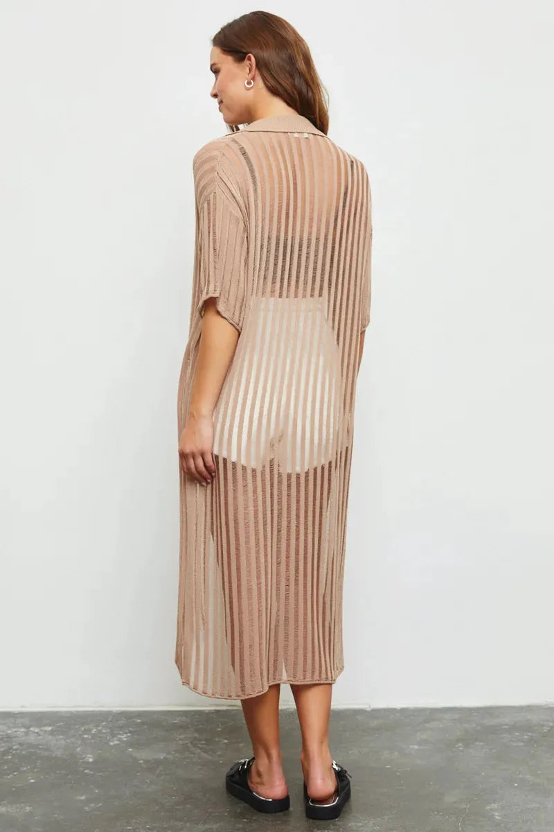Women cover up, duster, elbow-length sleeves, mid-calf length, lightweight, solid color, knit ribbed, collared neckline, button down closure, relaxed and flowy, ideal for layering over other clothing items, chic, stylish, fashion, perfect dress for day or night, hot and cool weather!