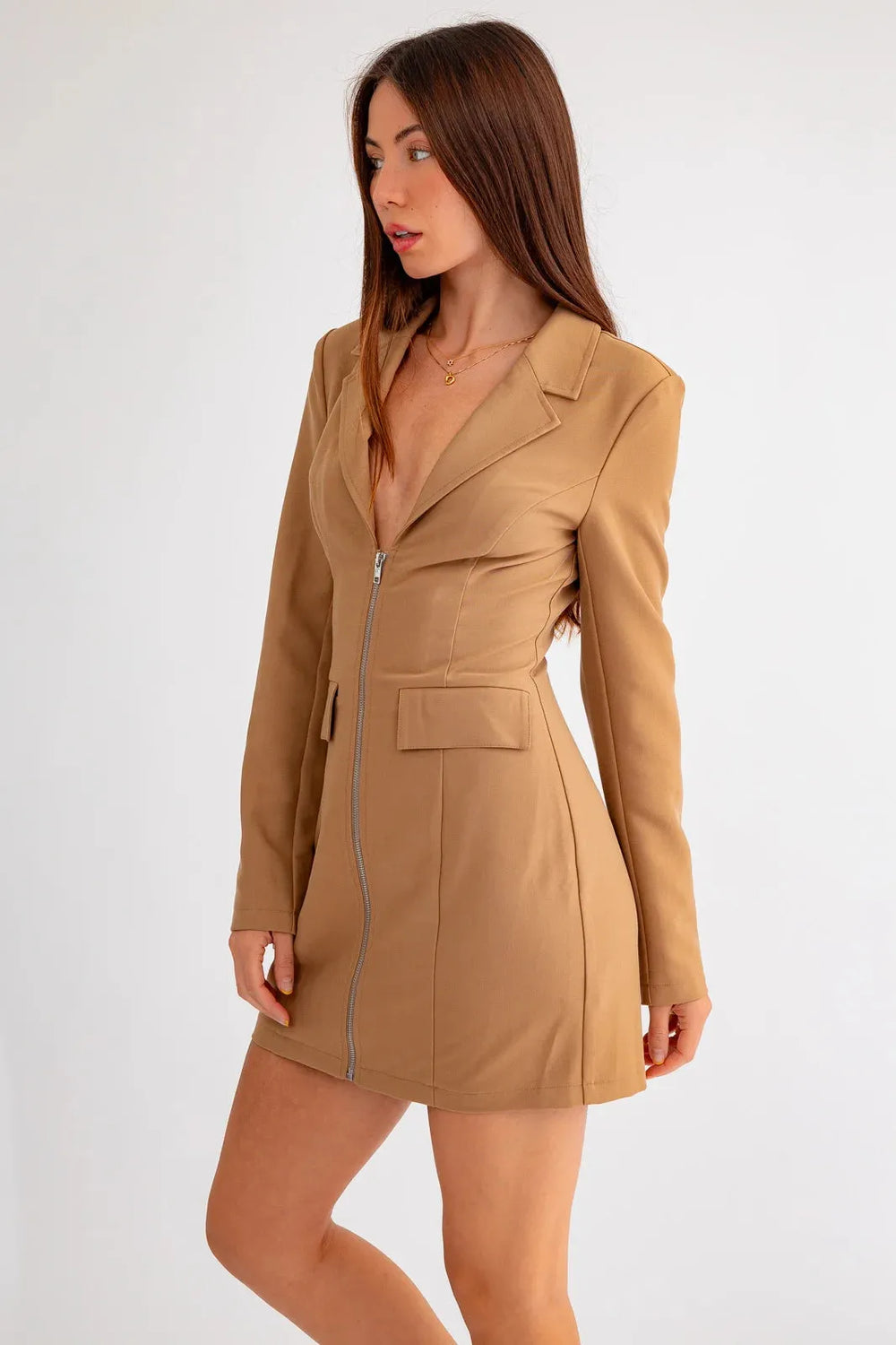 Stay sharp and stylish with our Long Sleeve Front Zipper Mini Blazer Dress. Featuring a sleek front zipper and long sleeves, this dress adds a touch of elegance to any outfit. Made with high-quality materials, this dress offers both comfort and sophistication for any occasion.