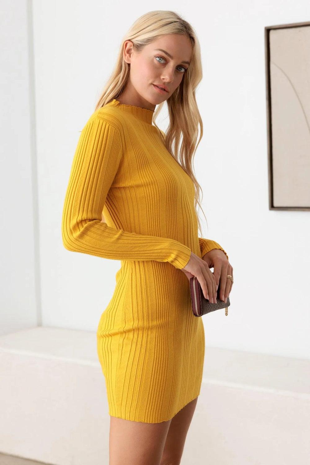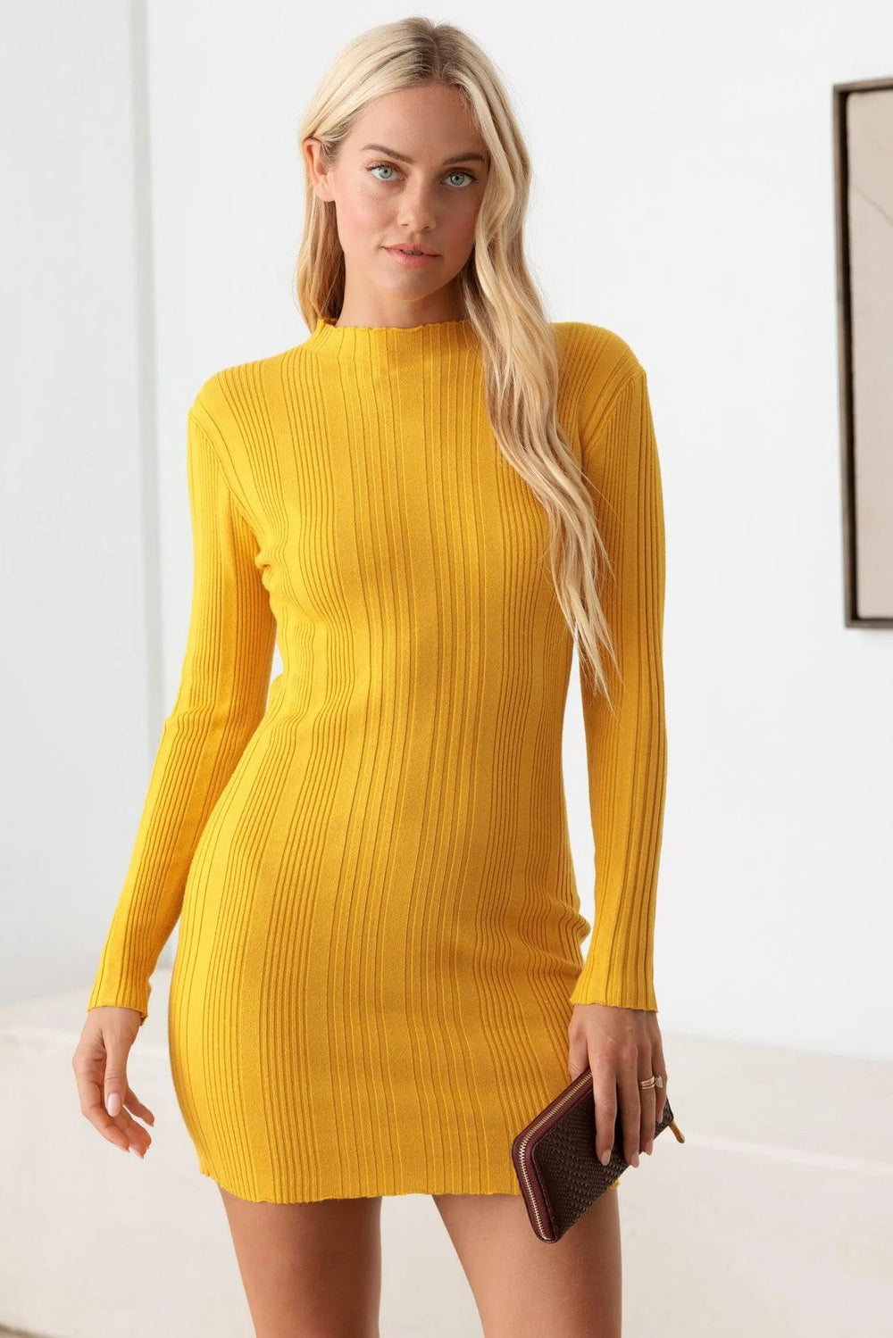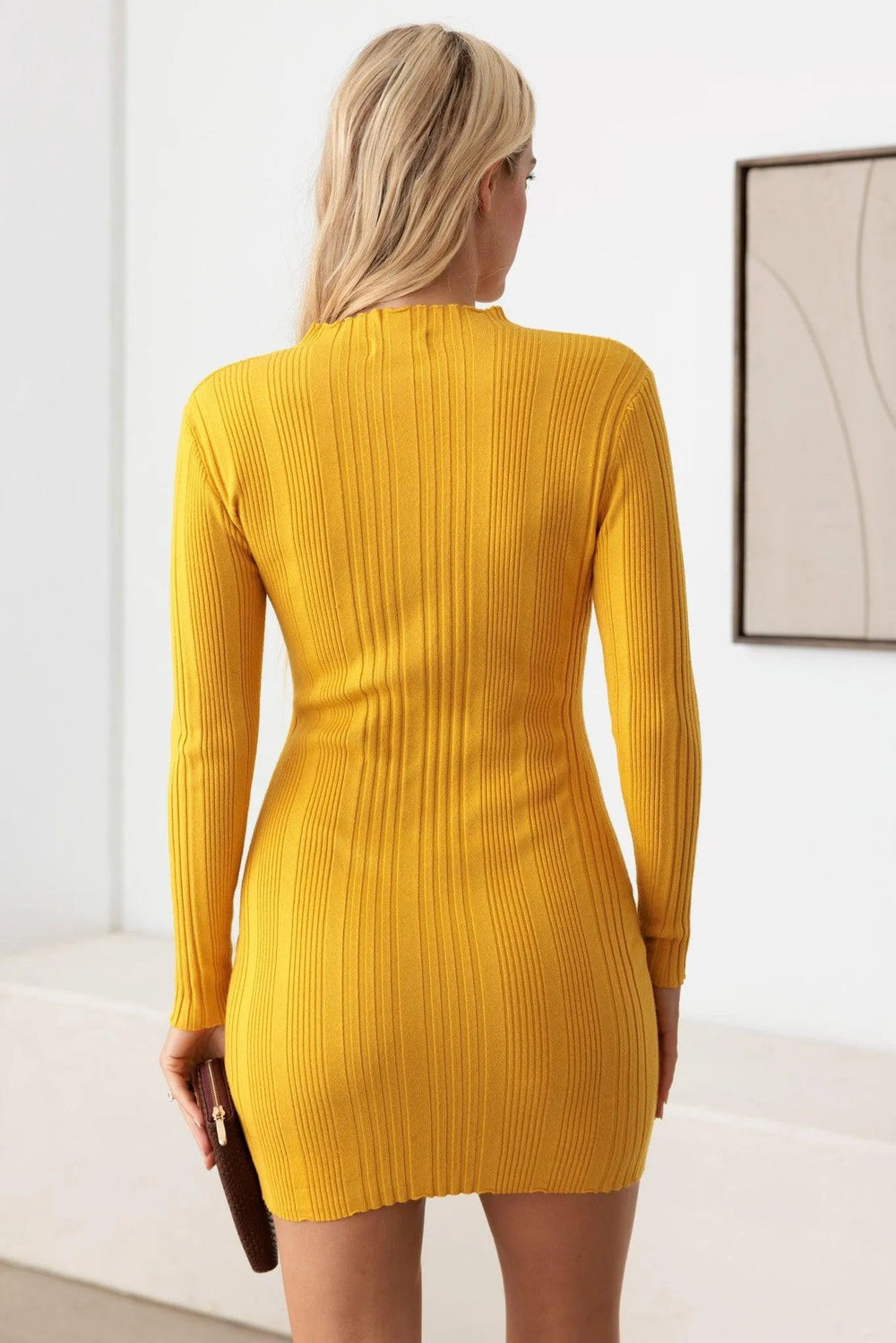 🖤 Features: Ribbed knit mini dress available in Khaki and Honey, high neckline, long sleeves, vertical ribbed texture, form-fitting silhouette. Perfect for casual and dressy occasions, offering a flattering and stylish fit.