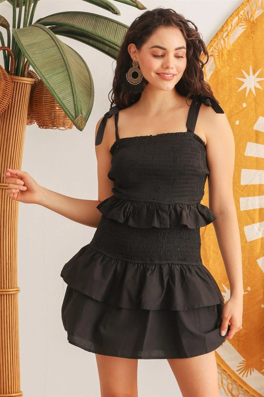 🖤 Item Features: Black, cotton material, smocked bodice, ruffle, sleeveless, self-tie straps, mini length, stretchy, lined, cute, girlish, cool, stylish, elegant, romantic